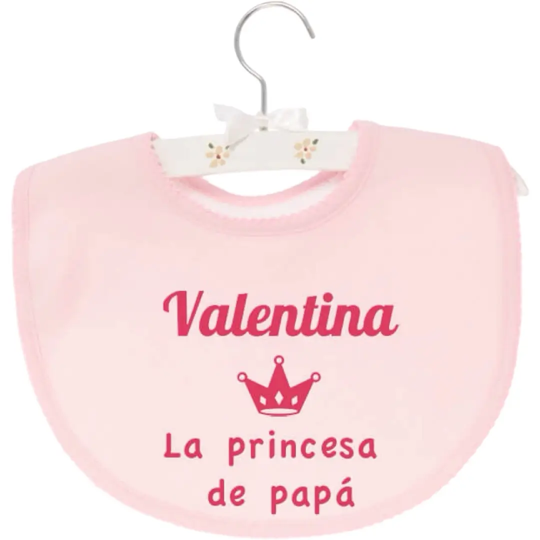 Babero personalizado princesa, con dibujo de una corona y el título «Princesa de papá», se personaliza con el nombre del bebé, todo ello en el color que prefieras, mediante IDT – impresión digital textil – que asegura la mejor calidad y duración. Dale capa para proteger más al bebé, peinado en blanco, azul o rosa por delante, y felpa en envés. Escoge el color del babero y del dibujo que más te guste. El modelo en color blanco lleva el ribete en beige. En otros modelos, en el mismo color escogido.