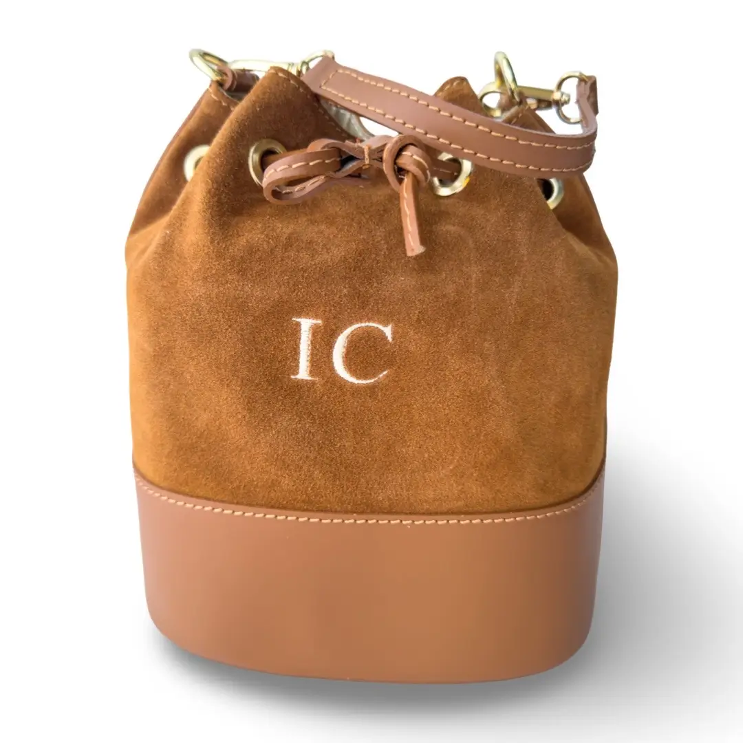 Está confeccionado en ante y piel en varios colores. Además del asa de mano, lleva un asa bandolera en el mismo color del bolso, pero también puedes combinarlo con una de nuestras correas. El bolso personalizable está forrado en piel en su interior y se cierra mediante cremallera y cordón ajustable.