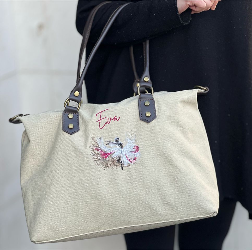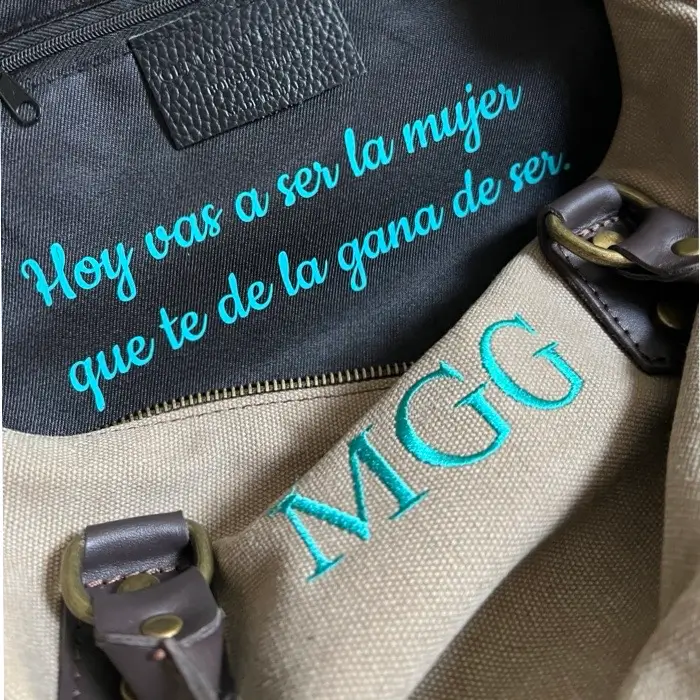 Bolso de loneta de amplio tamaño, que puedes configurar con la correa étnica ajustable que más te guste, además de la que va con el bolso. Este bolso universidad personalizado es como nuestro bolso Sofía pero con las asas de cuero marrón oscuro. Muy completo y práctico, dispone de bolsillo interior con cremallera, y cierre exterior con cremallera. Podrás llevar todo lo que necesites en este bolso a la universidad, o para el día a día. Podemos personalizarlo con el nombre o iniciales bordados en el color y tipo de letra que selecciones en el cuadro de personalización. Entrega con tu personalización en 24 hrs. en península.