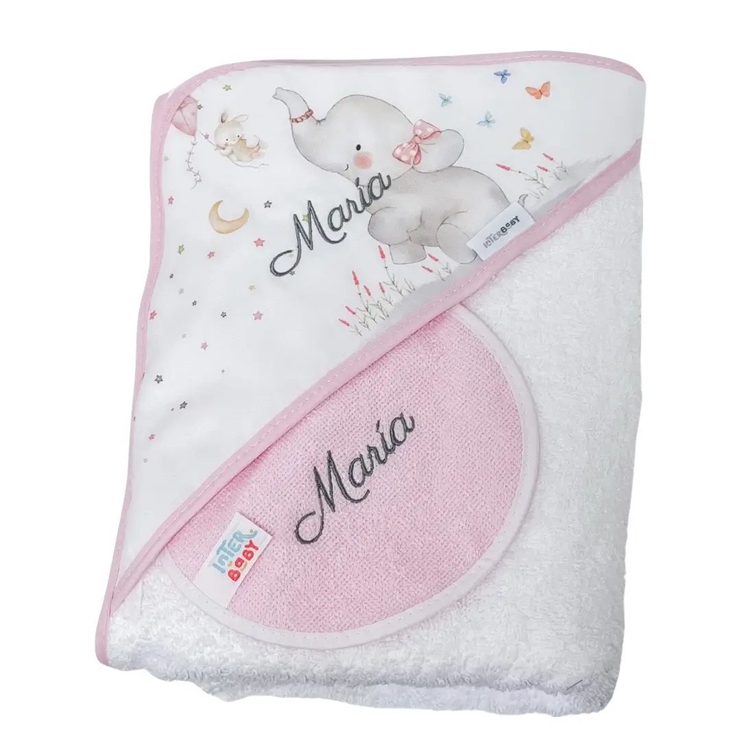 apa de baño bebé personalizada con capucha, de esponjoso rizo de algodón blanco 100%, con ribete de color y dibujo estampado en la capucha a elegir en el desplegable. Además la capa lleva un babero a juego que puedes bordar también.