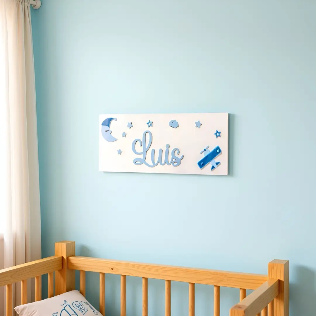 Este cuadro infantil destaca por la personalización con el nombre en gran tamaño realizado en metacrilato, aportando relieve y un efecto moderno. Su diseño minimalista con estrellas decorativas lo convierte en una opción ideal para habitaciones de bebés y niños.