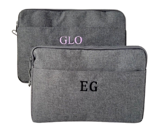 Estuche para iPad o tablet con diseño contemporáneo. La funda para portatil personalizada es para un ordenador de 13 pulgadas. Podemos personalizarla con sus iniciales o nombre. Tiene capacidad para iPad o para un ordenador de hasta 13″. Cuenta con un compartimento principal acolchado con cierre de cremallera, un bolsillo exterior y un interior con forro suave al tacto. La funda va bordada en la tipografía de la foto. Si quieres otra fuente, indícanoslo en comentarios. La funda está disponible en gris claro o gris marengo y puedes escoger el color de bordado ¡que más le guste! Entrega en 24 hr. en península, con tu personalización.