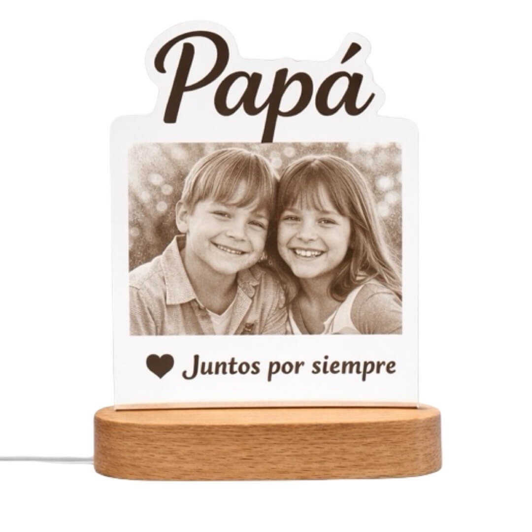 La lámpara Papá con foto personalizada es un regalo lleno de emoción que convierte un recuerdo especial en una pieza decorativa iluminada. Diseñada en metacrilato transparente de alta calidad y combinada con una elegante base de madera con luz LED, esta lámpara permite grabar la palabra Papá en formato decorativo, acompañada de una fotografía y un mensaje personalizado, creando un detalle único y con un gran valor sentimental.