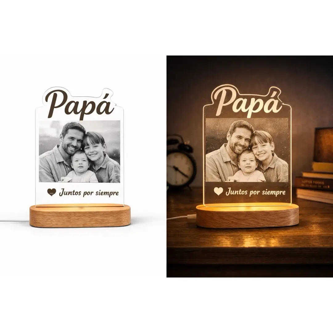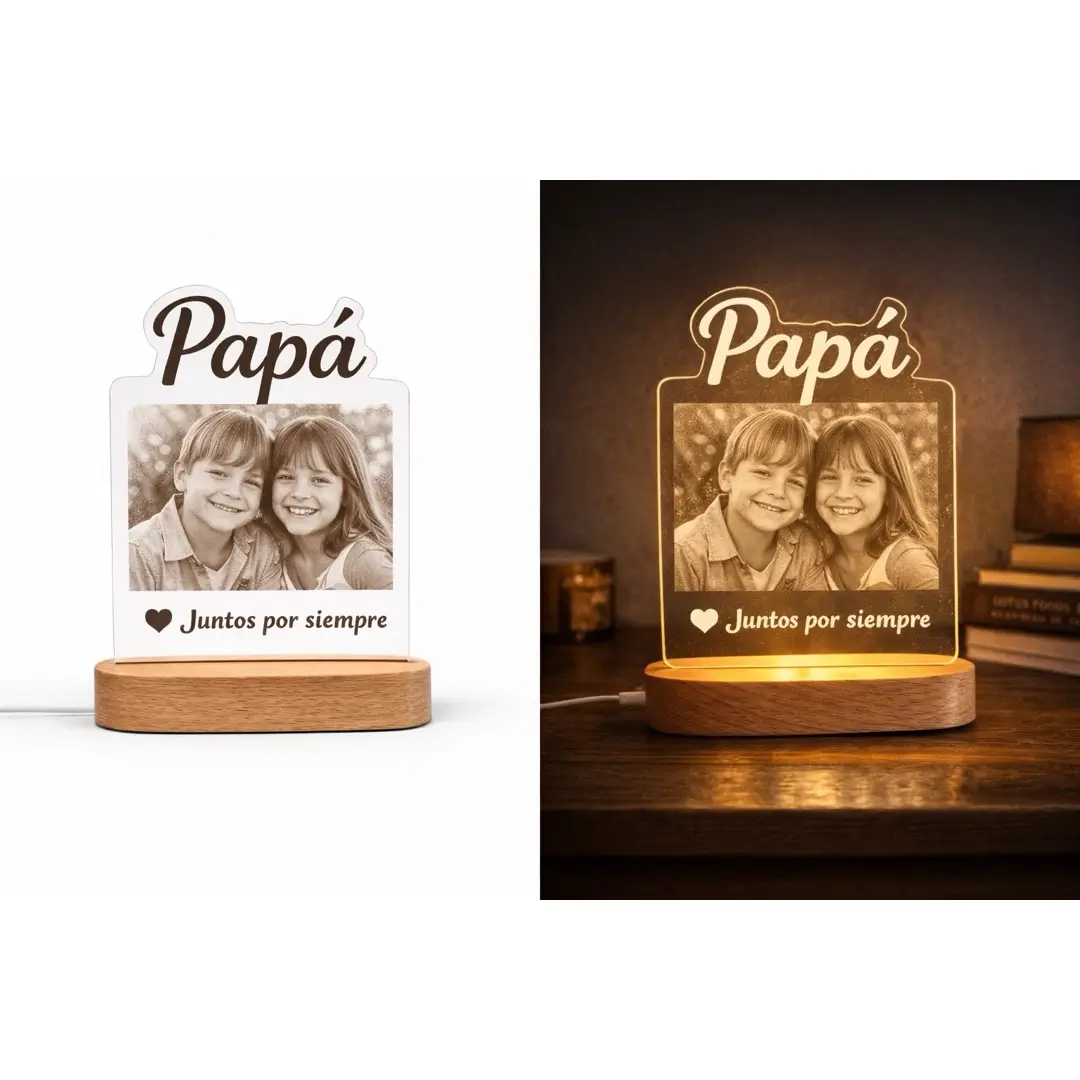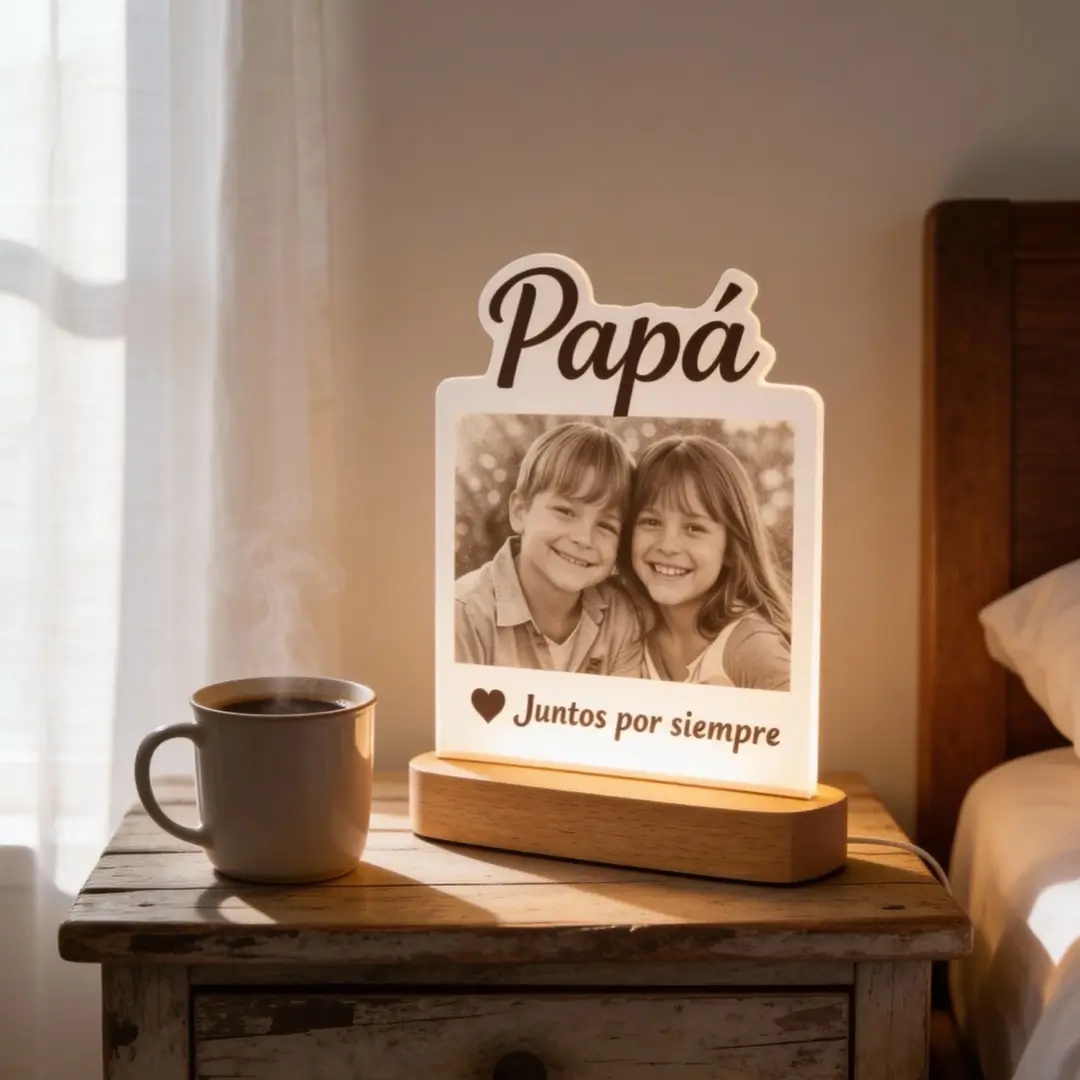 Si buscas un regalo para el Día del Padre con foto, esta lámpara es una de las opciones más completas y significativas. No solo decora, sino que transmite cariño, cercanía y recuerdos compartidos cada vez que se enciende.