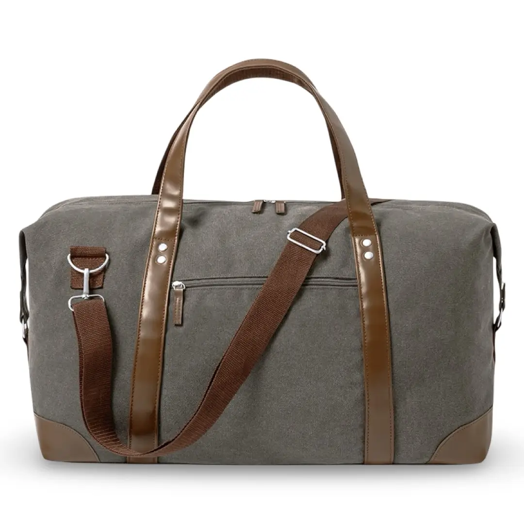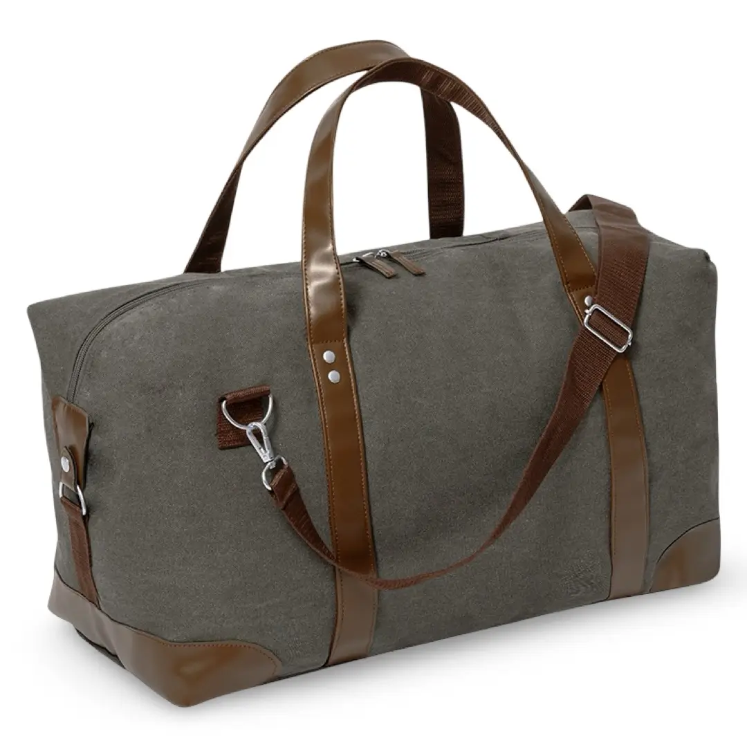 Fabricado en canvas de alta densidad (475 g/m²), con asas y refuerzos en polipiel marrón, la bolsa de viaje con logo destaca por su aspecto sofisticado y su durabilidad, ideal para acompañarte en escapadas, viajes o el día a día.