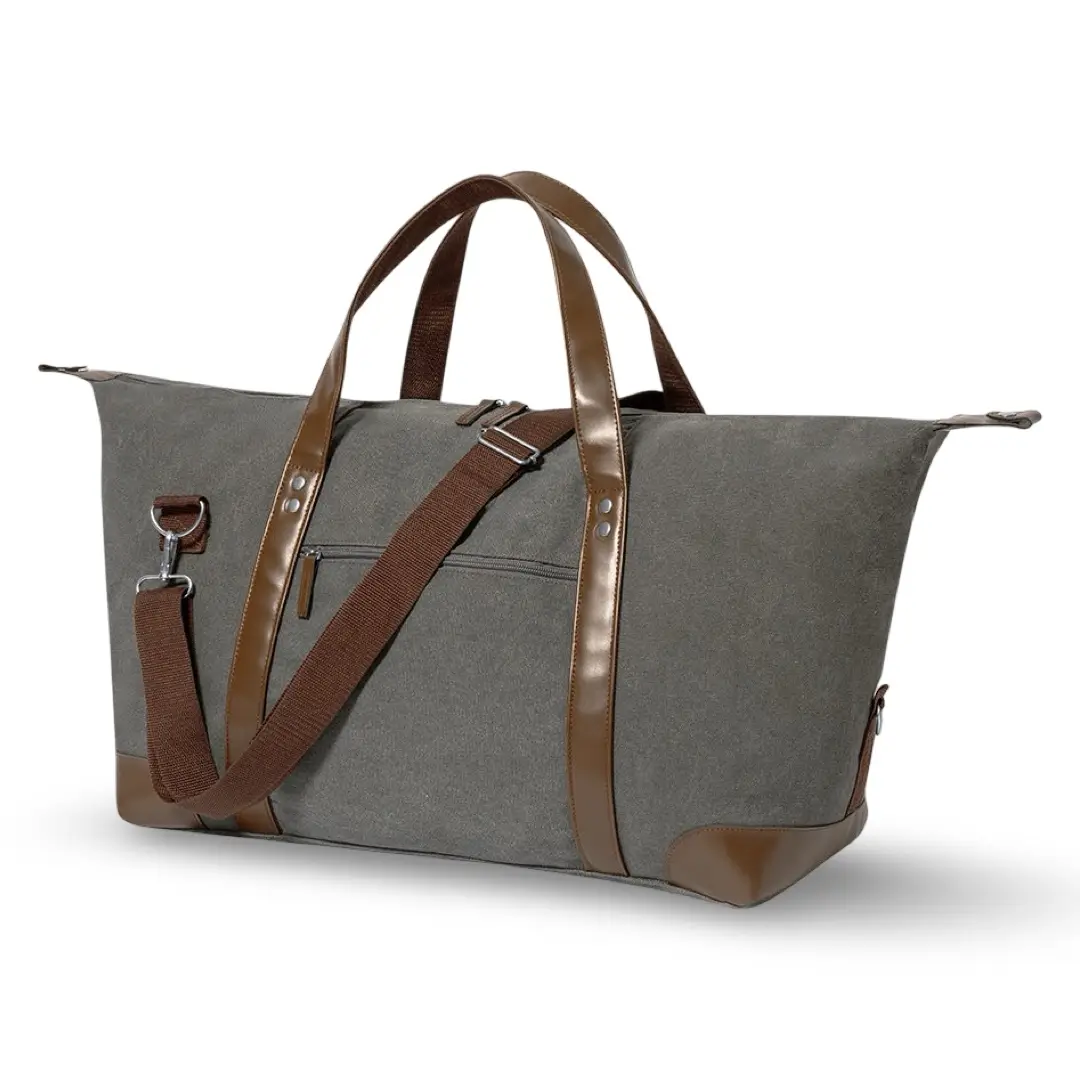 Fabricado en canvas de alta densidad (475 g/m²), con asas y refuerzos en polipiel marrón, la bolsa de viaje con logo destaca por su aspecto sofisticado y su durabilidad, ideal para acompañarte en escapadas, viajes o el día a día.