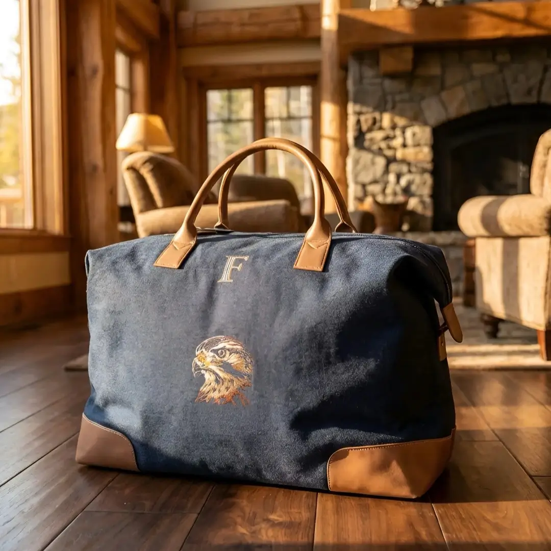 maleta con iniciales bordadas. Hecha en tejido lavado y no le falta detalle, con asas de piel vegana y tachuelas para apoyar en el suelo. Las maletas personalizadas con iniciales son un regalo perfecto.