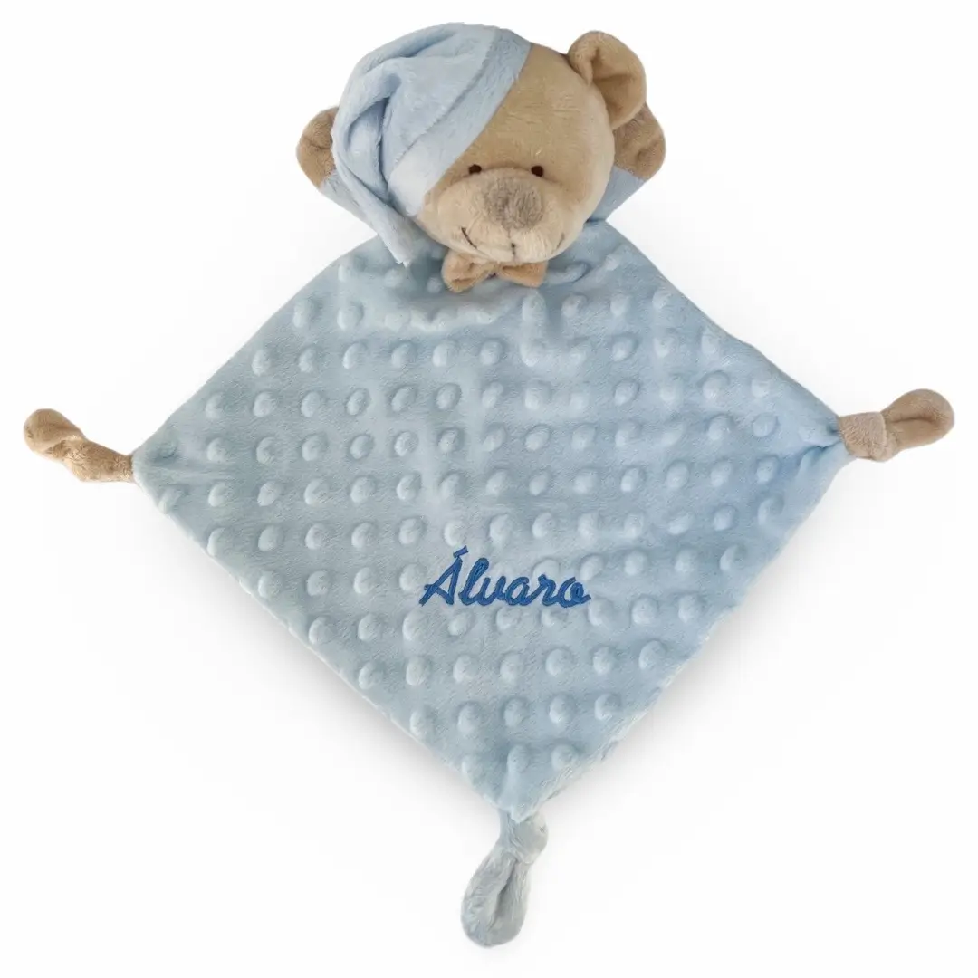 Doudou cuadrado de tela aterciopelada, con la cabeza de osito y con topitos en relieve, que acompañará al bebé en sus sueños. Los peluches bebes personalizados son un regalo ideal para un recién nacido ya que van con su nombre y lo usarán para dormir.