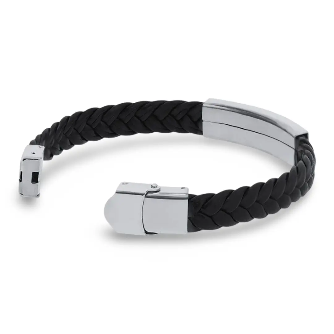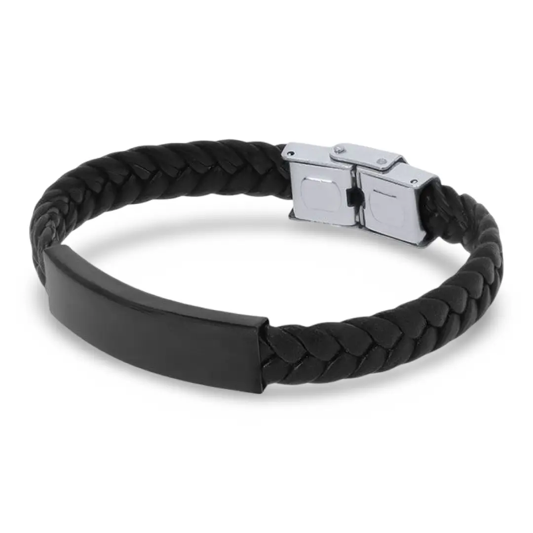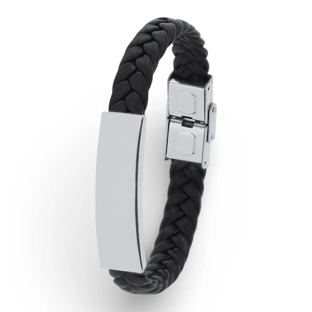 La placa se personaliza mediante grabado láser, lo que permite añadir iniciales, nombres, fechas o mensajes especiales con un acabado duradero y de alta calidad. Además puedes personalizar tanto la parte de alante como la de atrás. El contraste entre la piel trenzada y el acero aporta un toque sofisticado, ideal para quienes buscan una joya única y personalizada.