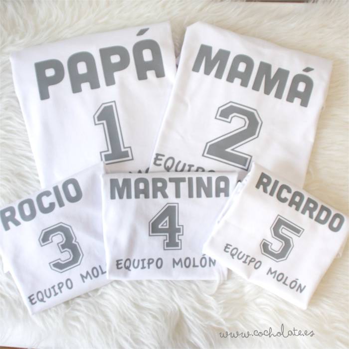 La camiseta del padre va decorada con el texto “Papá” y personalizada con el número 1 y el apellido. La de la madre va decorada con el texto “Mamá” y personalizada con el número 2 y el apellido. La camiseta del hijo va personalizada con su nombre y el número 3. Puedes elegir donde irán estampadas las camisetas, si en el pecho o espalda, irán todas en el mismo sitio.