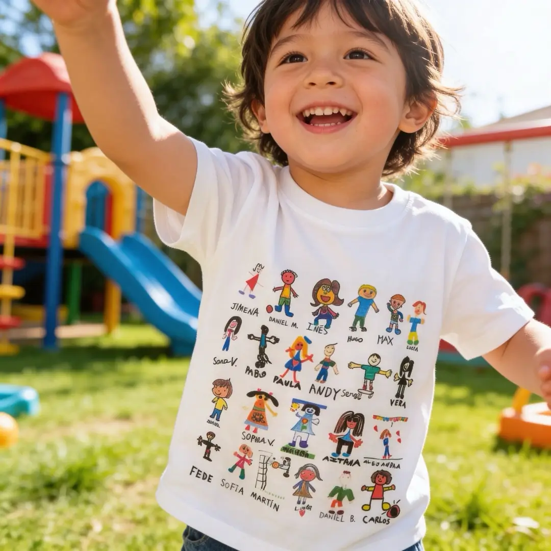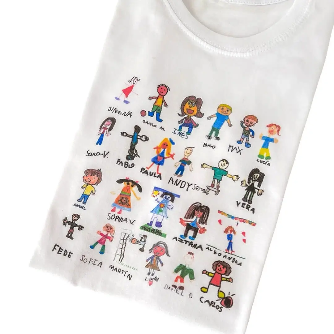 El resultado es algo único, que nadie más tendrá ya que la composición es de dibujos hechos por niños. son regalos originales para un profesor que lucirá orgulloso y, no solo eso, sino la ilusión de los niños al ver su pequeña obra de arte y la de sus amigos en una camiseta.