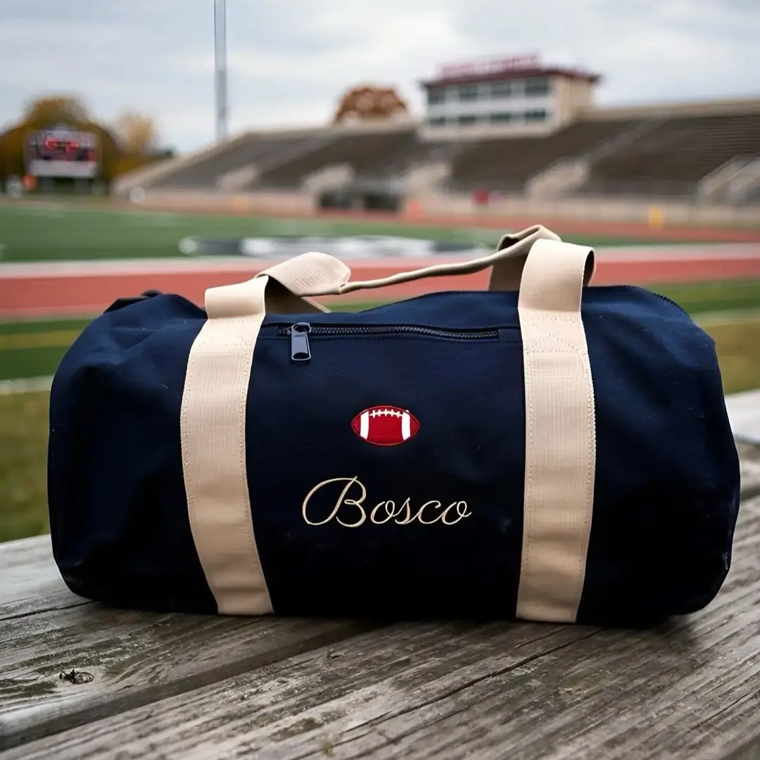 Bolsa de de deporte infantil personalizable mediante bordado con el nombre o iniciales. Una bolsa ideal para las actividades extraescolares. La bolsa fin de semana personalizada está disponible en dos tonos con bolsillo exterior, y cremallera. Además puedes llevarla también colgada.