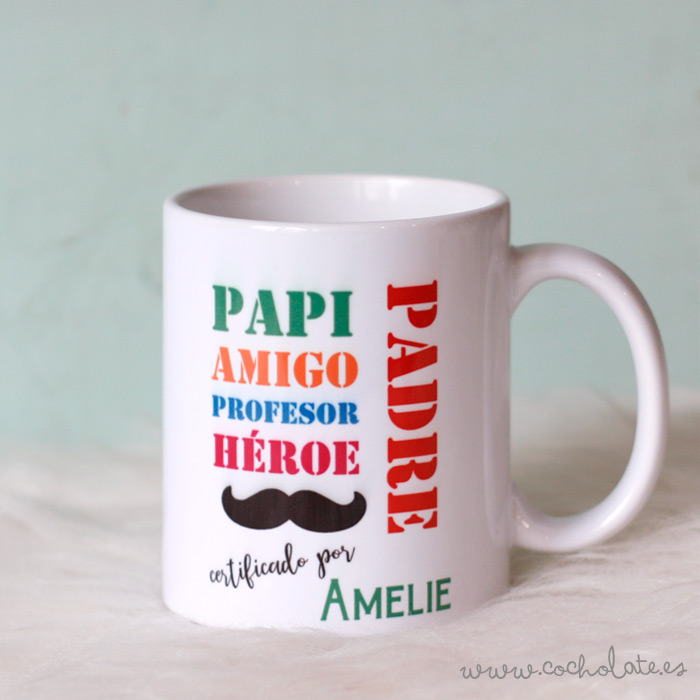Taza con la frase Papá, padre, héroe, profesor y un bigote sobre el nombre de los hij@s. Ponemos el texto en la lengua que quieras (Catalán, Valenciano, Gallego, etc.), siempre que escribas la traducción completa en el cuadro correspondiente entre la opciones de personalización. Entrega en 24 hrs. en península (personalización incluida).