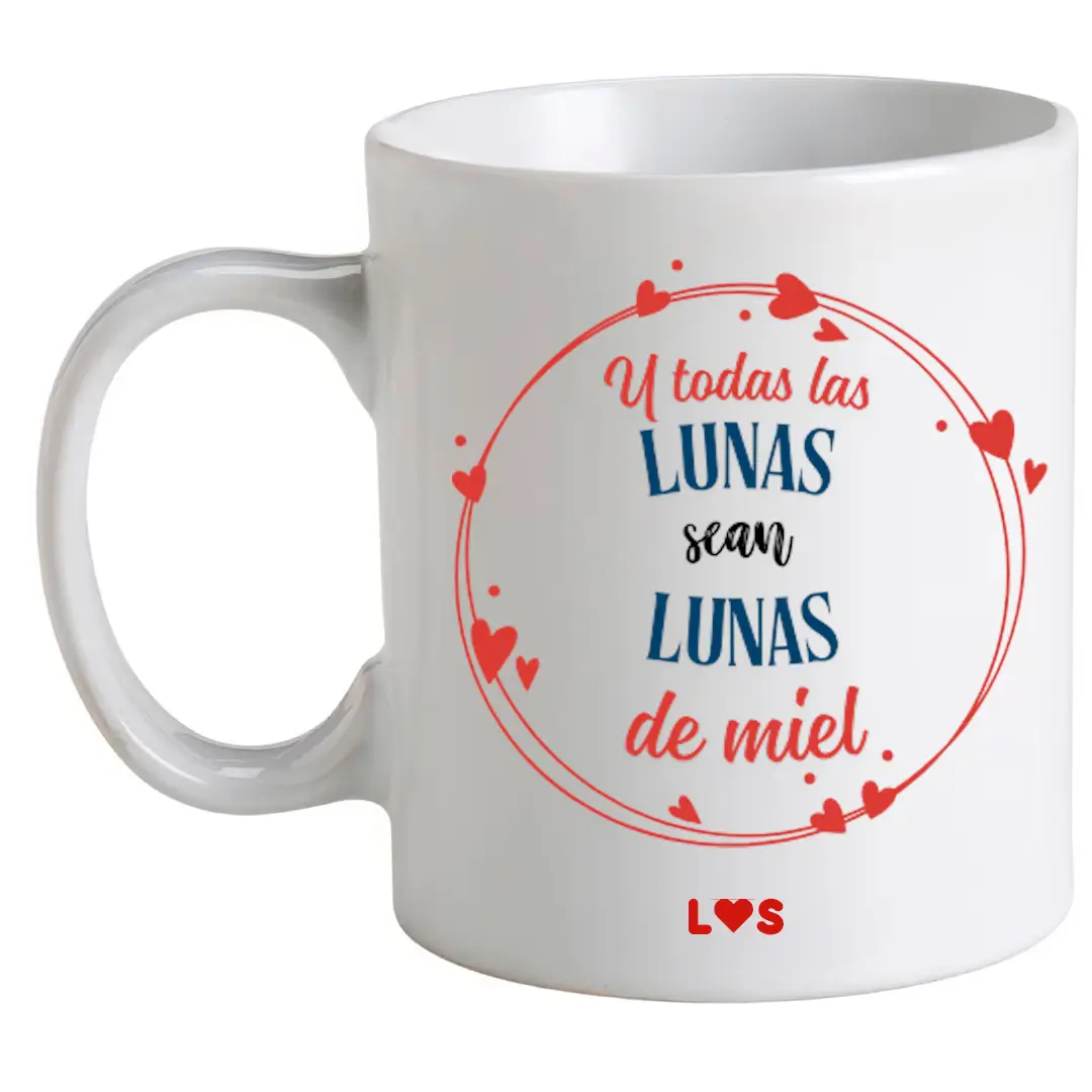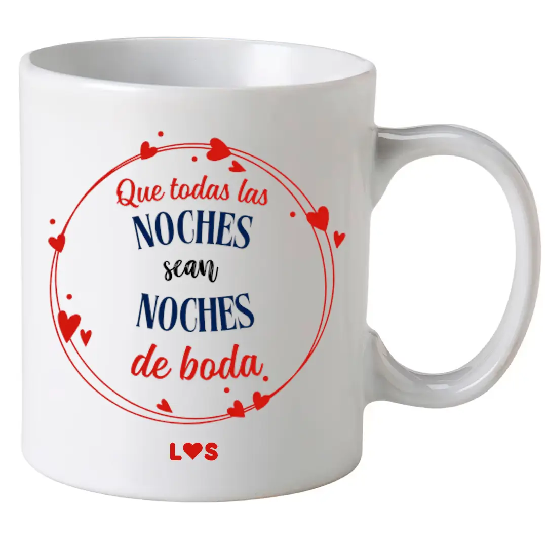 https://cocholate.es/tazas/taza-personalizada-noches-de-boda/42195 Taza personalizada noches de boda Taza personalizada para boda ideal para decirle a alguien que le quieres, o celebrar un aniversario. La taza va sublimada con la mítica frase, "que todas las noches sean noches de boda" en una cara. En la otra cara la frase es "y todas las lunas sean lunas de miel" y las iniciales. Taza personalizada San Valentín. Entrega en 24 hrs. en península (personalización incluida).